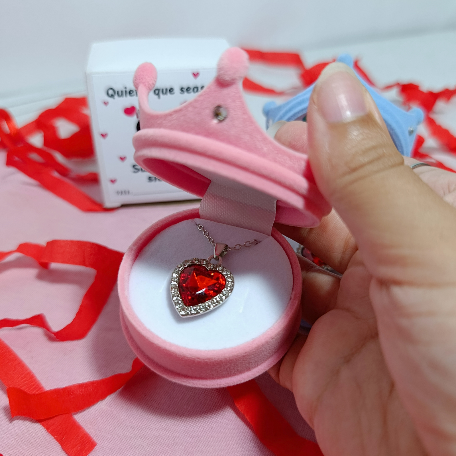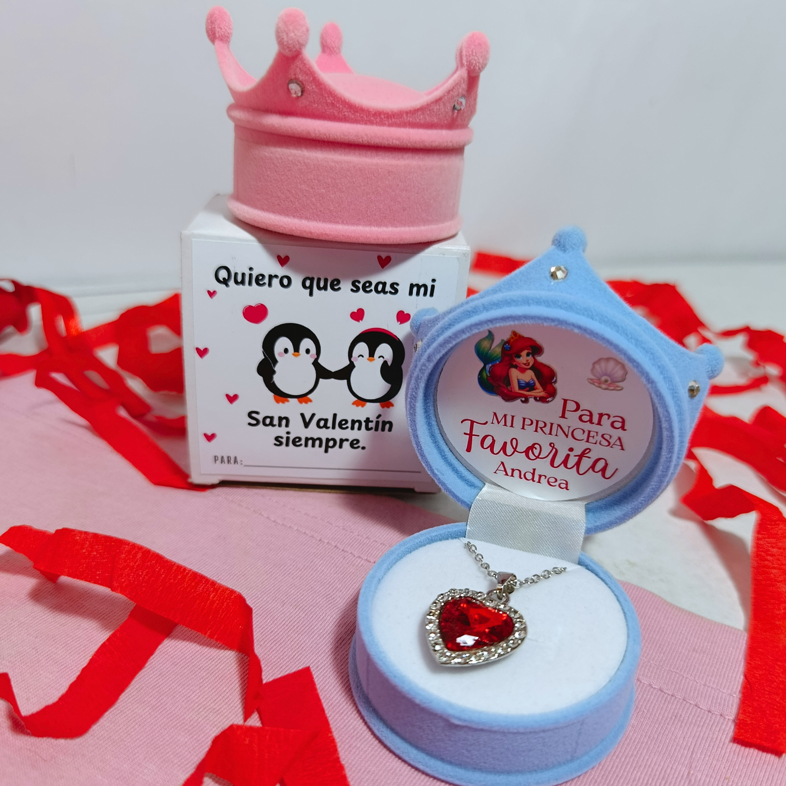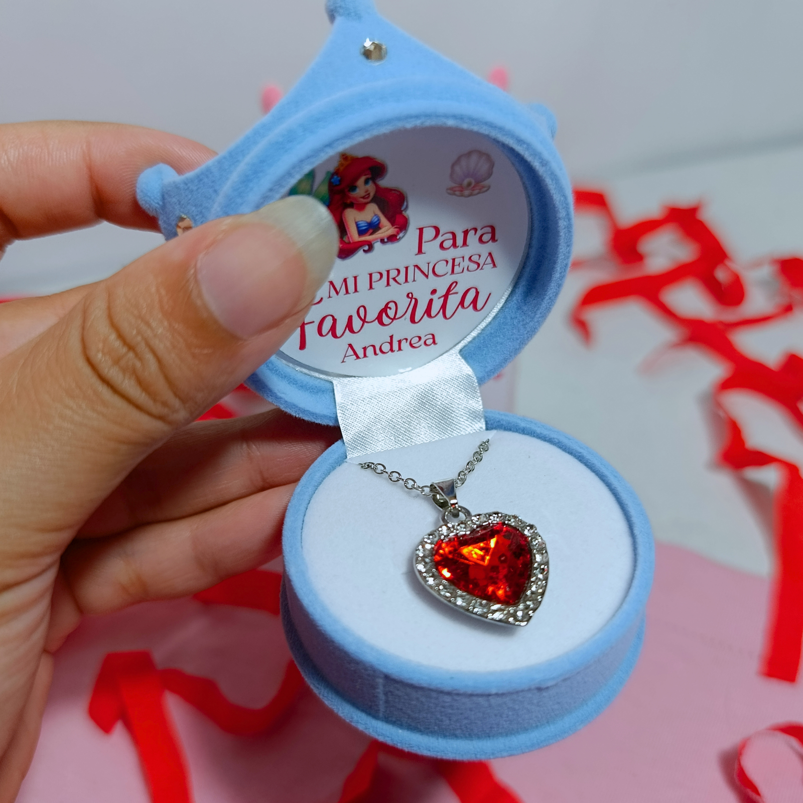 Cadenita princesa corazón rojo con anillero corona en rosa o celeste.